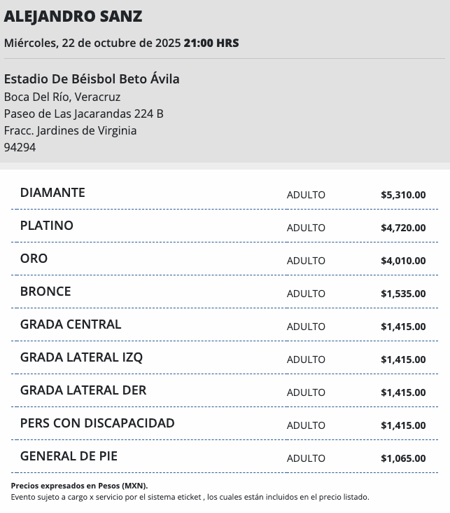 Los boletos ya están a la venta en www.eticket.mx, con precios que van desde $1,065 en zona general hasta $5,310 en zona diamante, los cuales incluyen cargos por servicio.