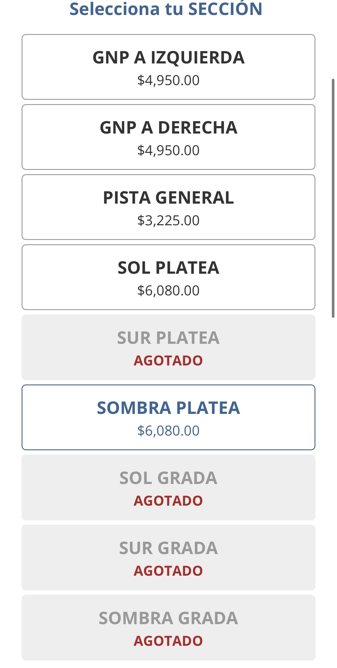 GNP Izquierda y GNP Derecha: $4,950.00 Pista General: $3,225.00 Sol Platea: $6,080.00 Sombra Platea: $6,080.00