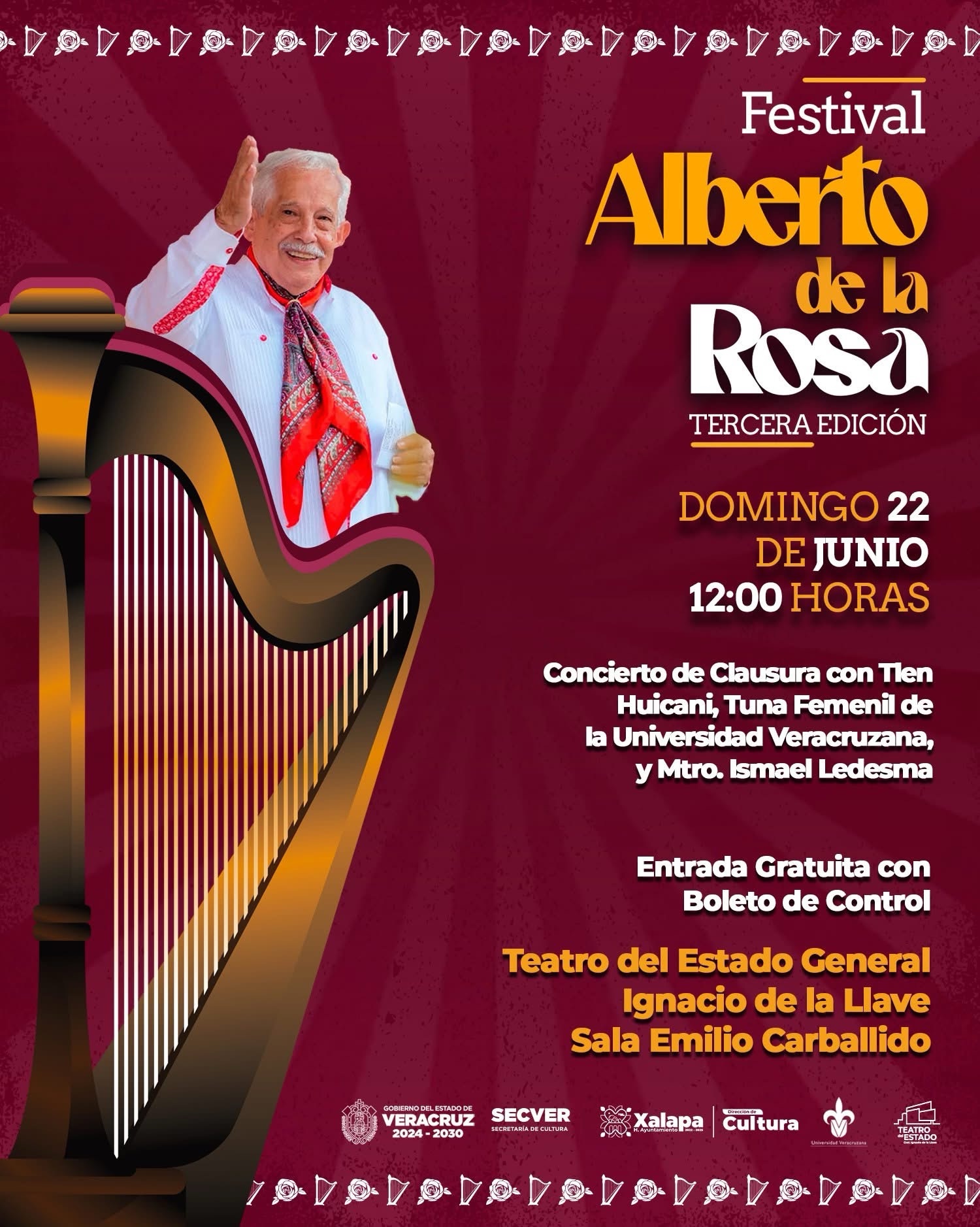 Xalapa, Ver., 12 de junio de 2025.- Con el objetivo de rendir homenaje a una de las figuras más destacadas de la música tradicional veracruzana, el Ayuntamiento de Xalapa invita a la ciudadanía a la tercera edición del Festival “Alberto de la Rosa”, que se llevará a cabo del 19 al 22 de junio.