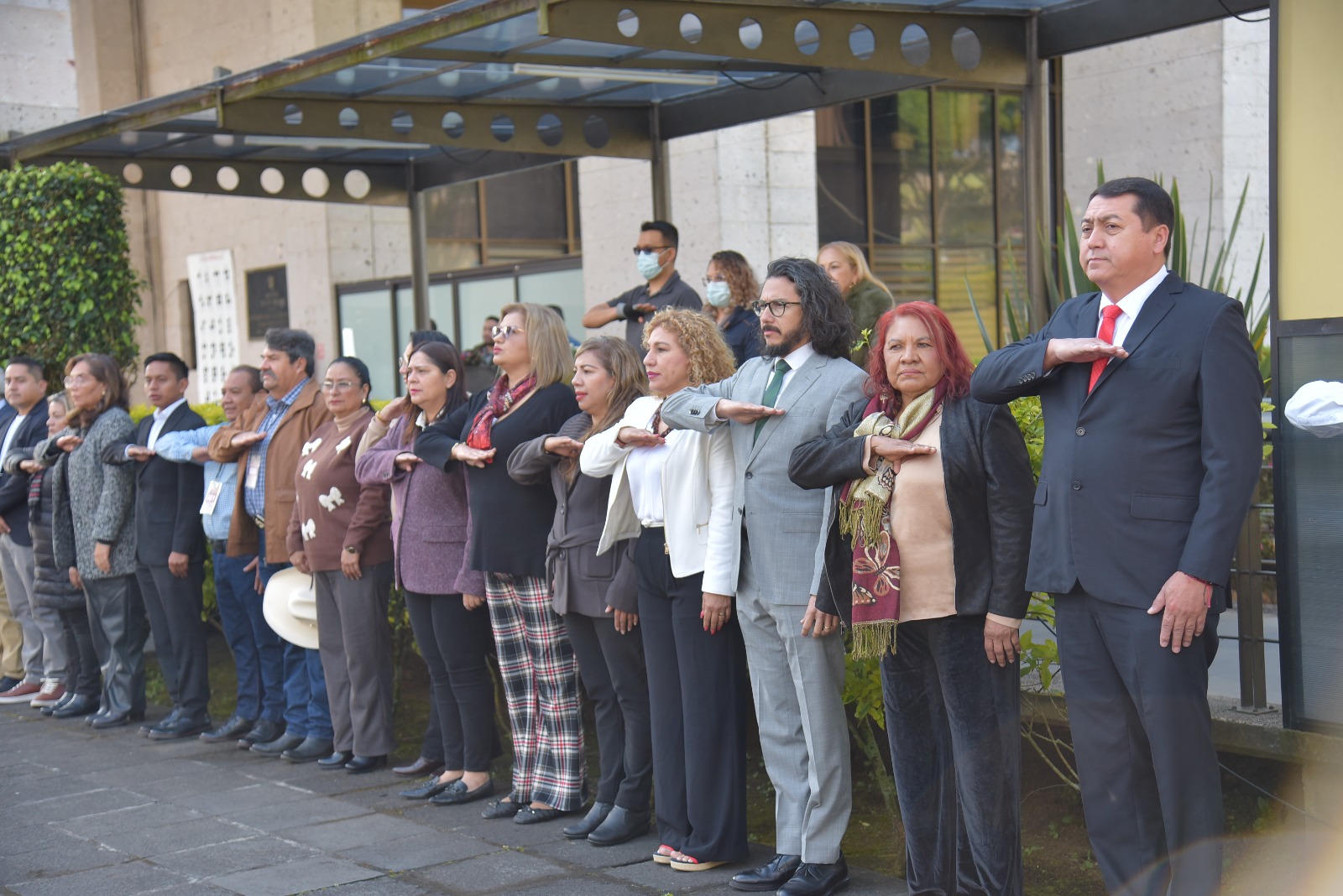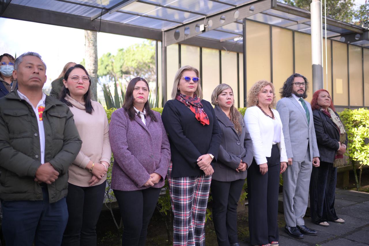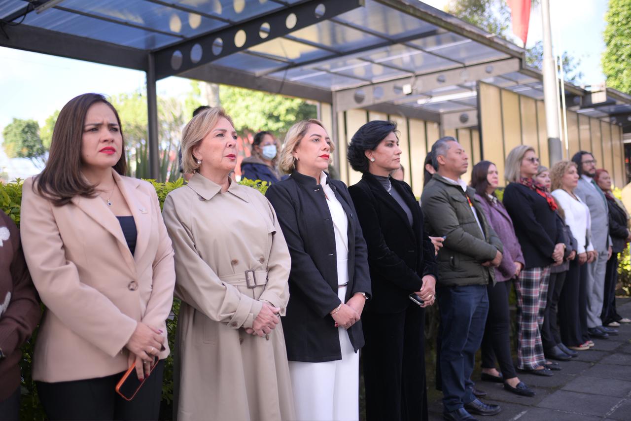 Esta mañana, en la explanada del Palacio Legislativo y con la presencia de las diputadas Victoria Gutiérrez Pérez, Elizabeth Morales García, Daniela Flores Barnils, Liud Herrera Félix, Miriam García Guzmán, Guadalupe Vázquez González, Laura Nallely Mejía Larios, Ingrid Jeny Calderón Domínguez, Bertha Rosalía Ahued Malpica, Astrid Sánchez Moguel y María Elena Córdova Molina y de los diputados Carlos Marcelo Ruiz Sánchez y Urbano Bautista Martínez, dio inicio este acto. Los honores al lábaro patrio estuvieron a cargo de la banda de guerra y escolta del Sindicato Único de Trabajadores al Servicio del Poder Legislativo (SUTSPL).
